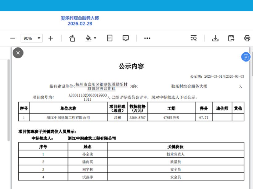 勤乐村综合服务大楼 中标公示图