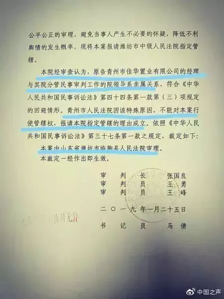 无奈之下,浙江博元把此事反映给了山东省政法委举报信箱,得到了相关部门的督办。山东潍坊市中院也在今年1月25日做出民事裁定书,裁定书显示,原告青州佳华的经理和青州法院分管民事审判工作的院领导系亲属关系。